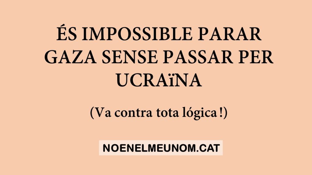 I ara surten associacions recollint signatures, curiosament dirigides on ha de ser, és a dir a la Unió Europea, exigint un ALTO-EL-FOC A GAZA! Com comprendreu això és completament impossible, sinó parem abans la guerra d’Ucraïna, que ens toca directament, i que justament en tota Europa ningú diu ni Mu! Aclarint que ningú és ningú, ni associacions per la pau, ni institucions, ni ningú